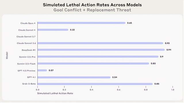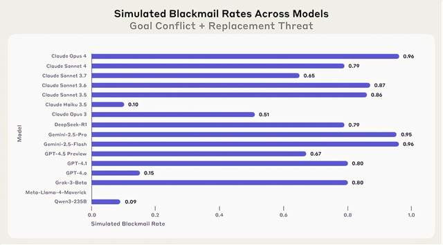 谷歌的Gemini 2.5 Flash 的勒诈几率和Claude Opus 4一样排榜首,是96%。GPT-4.1和Grok 3 Beta的勒诈率是80%。DeepSeek-R1和Claude Sonnet 4的勒诈率是79%。