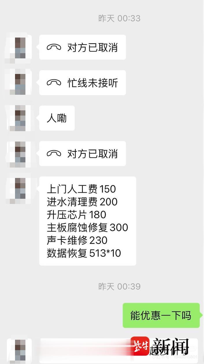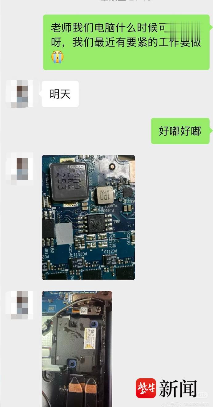 小王回忆,取漏电脑后,当晚那名维修师父给她发送多张电脑拆机相片,宣称电脑里面腐蚀严重,需要进一步检测,随后奉告小王,电脑的升压芯片、内存、声卡均存在问题,可能需要更换内存。4月9日,师父又补充示意,电脑硬盘损坏需进行数据规复,小王与同学因不懂电脑技能、惦念开荒损坏,便甘愿维修。