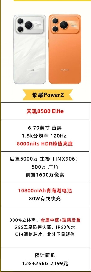 5.荣耀Power2:搭载天玑8500 Elite,主打超长续航。6.79英寸1.5K直屏支持120Hz高刷,峰值亮度8000nit,户外可视性极佳。影像方面采用5000万主摄(IMX906)+5000万广角+1600万长焦,覆盖日常拍摄场景。最引人注目的是10800mAh青海湖电池+80W快充,续航能力远超同级。此外,斗鱼app3D超声波指纹、金属中框+玻璃背板、IP68+69防尘防水等配置,进一步提升综合体验。