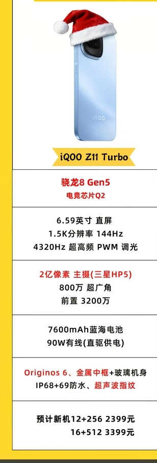 1. iQOO Z11 Turbo:搭载骁龙8 Gen5,配备6.59英寸1.5K直屏,支持144Hz高刷与4320Hz超高频调光,兼顾流畅与护眼。影像方面采用2亿像素主摄(三星HP5)+800万超广角+3200万长焦,覆盖全场景拍摄需求。7600mAh蓝海电池+90W快充的组合,彻底解决续航焦虑。系统方面搭载OriginOS 6,支持超声波指纹与IP68+69防尘防水,性价比突出。