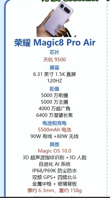 9. 荣耀Magic8 Pro Air:主打轻薄与影像,搭载天玑9500,配备6.31英寸1.5K直屏,支持120Hz高刷。影像采用5000万主摄+5000万超广角+6400万潜望长焦,覆盖全场景拍摄。5500mAh电池+90W有线+80W无线的组合,在轻薄机身下实现均衡续航。3D超声波指纹、Magic OS 10系统、IP68/69防尘防水等配置,彰显旗舰质感。