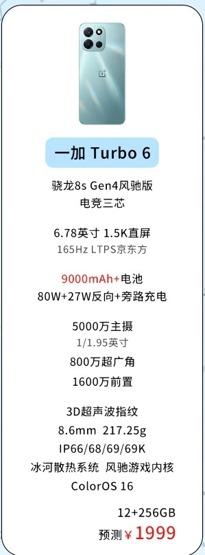 7.一加Turbo 6:搭载骁龙8s Gen4,定位中端市场。6.78英寸1.5K直屏支持165Hz LTPO,兼顾流畅与省电。影像采用5000万主摄+800万超广角+1600万前置,满足日常拍摄需求。9000mAh电池+80W快充的组合,在同价位中极具竞争力。3D超声波指纹、X轴线性马达、ColorOS 16系统等配置,进一步提升使用体验。