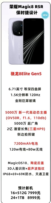 4.荣耀Magic8 RSR:主打影像旗舰,搭载骁龙8 Elite Gen5,配备6.71英寸1.5K等深四曲屏,支持120Hz刷新率。影像系统采用5000万主摄(新型动态主摄)+5000万超广角+2亿潜望长焦(三星HP9),三摄均支持旗舰级规格,配合MagicOS 10系统与徕卡调校,成像质量达到行业顶尖水平。7200mAh电池+120W快充+80W无线的组合,续航与补能效率兼备。