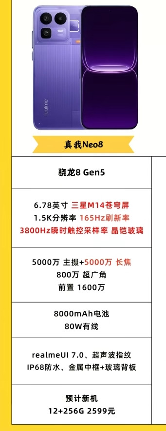 2. 真我Neo8:同样搭载骁龙8 Gen5,但定位更偏向游戏体验。6.78英寸三星M14苍穹屏支持165Hz刷新率与3800Hz瞬时触控采样,操作响应更快。影像升级为5000万主摄+5000万长焦双旗舰镜头,前置3200万像素,自拍与远摄能力均属一流。8000mAh电池+80W快充进一步强化续航,金属中框+玻璃背板的机身设计兼顾质感与手感。