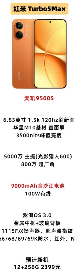6. 红米Turbo5 Max:定位中高端,搭载天玑9500S,配备6.83英寸1.5K 120Hz直屏,峰值亮度3500nit。影像采用5000万主摄(光影猎人600)+800万超广角,满足日常拍摄需求。9000mAh金沙江电池+100W快充的组合,兼顾续航与补能效率。金属中框+玻璃背板机身,配合澎湃OS 3.0系统,质感与体验并存。
