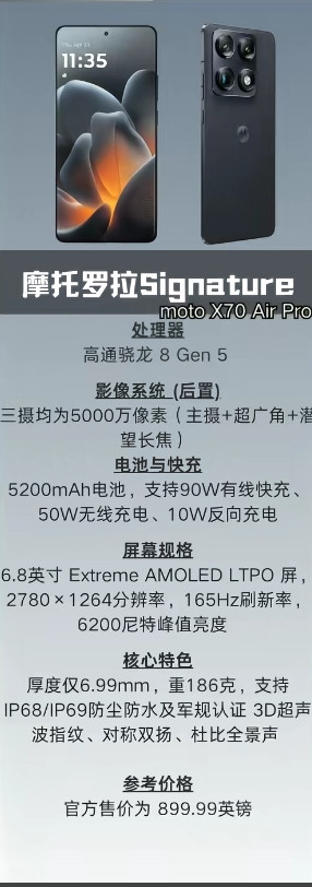 11.摩托罗拉X70 Pro Ari搭载高通骁龙8 Gen 5处理器,配备6.8英寸Extreme AMOLED LTPO屏幕,分辨率为2780×1264,支持165Hz刷新率,峰值亮度达6200尼特。后置三摄均为5000万像素,包含主摄、超广角和潜望长焦。内置5200mAh电池,支持90W有线快充、50W无线充电及10W反向充电。机身厚度6.99mm,重量186克,支持IP68/IP69防尘防水、军工认证3D超声波指纹、对称双扬声器和杜比全景声。
