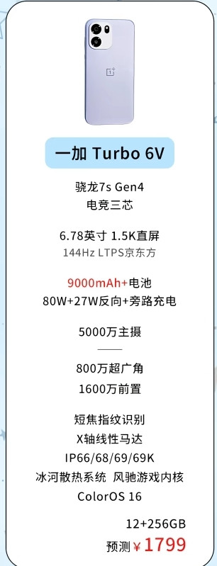 8. 一加Turbo 6V:定位略低于Turbo 6,搭载骁龙7s Gen4,但配置同样诚意满满。6.78英寸1.5K直屏支持144Hz LTPO,9000mAh电池+80W快充,续航表现优于多数同级机型。5000万主摄+800万超广角+1600万前置,满足日常拍摄需求。短焦指纹、IP66/68/69防尘防水等配置,兼顾实用性与耐用性。