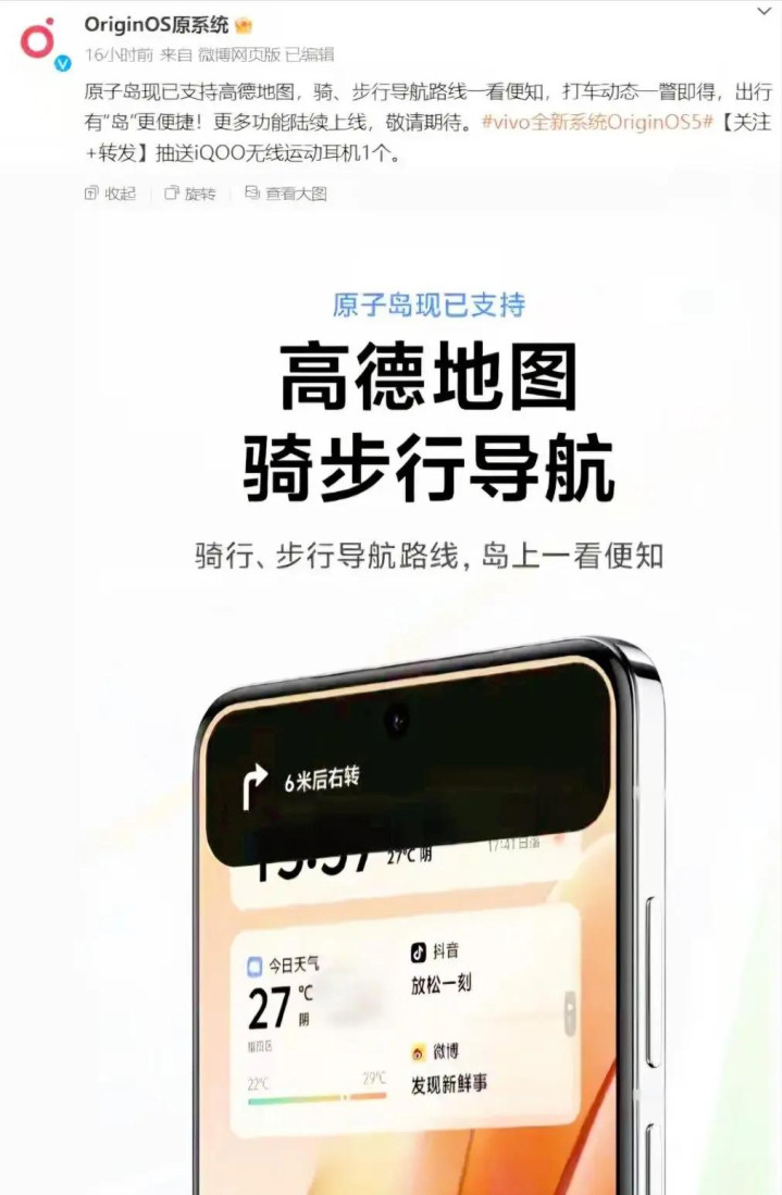 OriginOS的导航功能宣传图 · 展示OriginOS原子岛高德导航功能的宣传图
