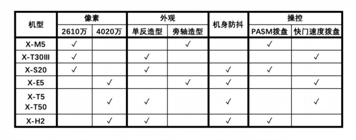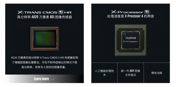 富士的产品线划分,主要看处理器、CMOS、和防抖。最新的组合是X-Processor 5处理器+4020万像素的X-Trans 5 HR CMOS+机身防抖。我们按照“大杯”和“超大杯”来给你捋一捋。